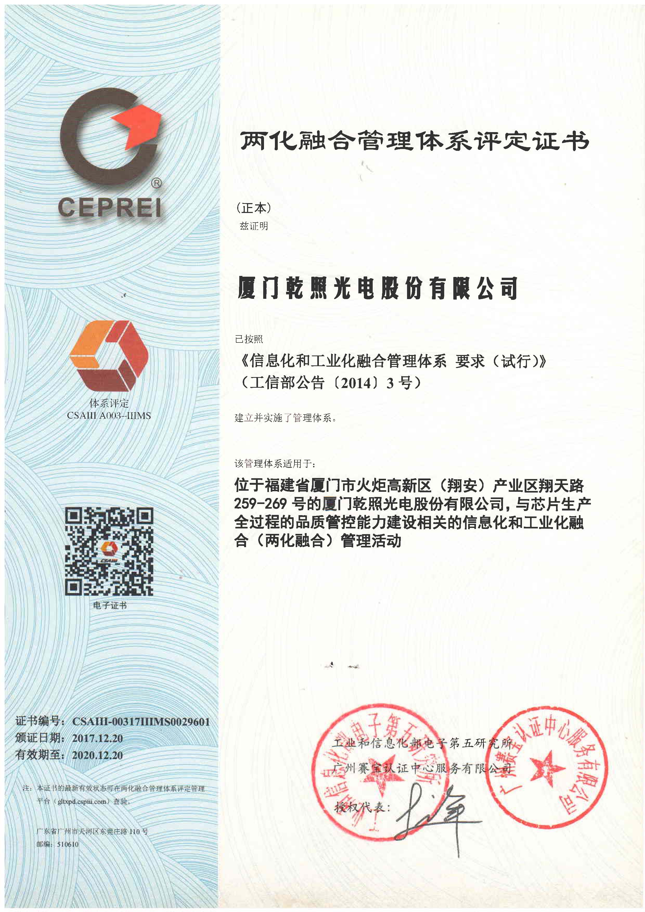 2017年12月20日,廈門乾照光電股份有限公司獲得兩化融合管理體系評(píng)定證書。這標(biāo)志著乾照光電已建立起兩化融合管理體系,并在推進(jìn)信息化和工業(yè)化深度融合方面取得顯著成效,在公司戰(zhàn)略轉(zhuǎn)型、組織變革、管理創(chuàng)新、技術(shù)融合和競爭力方面邁出堅(jiān)實(shí)的一步。