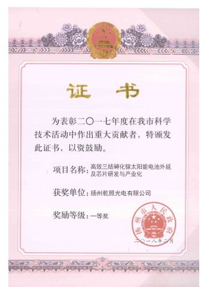 日前,揚(yáng)州市政府公布了2017年度科學(xué)技術(shù)獎(jiǎng)獲獎(jiǎng)情況。揚(yáng)州乾照光電有限公司申報(bào)的“高效三結(jié)砷化鎵太陽電池外延及芯片研發(fā)與產(chǎn)業(yè)化”項(xiàng)目,在眾多優(yōu)秀成果中脫穎而出,榮獲揚(yáng)州市科技進(jìn)步獎(jiǎng)一等獎(jiǎng)。