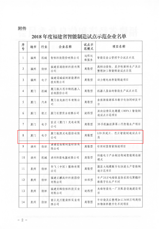 2018年,乾照光電在紅黃光領(lǐng)域,堅持“擴產(chǎn)+擴充高端產(chǎn)品”的發(fā)展戰(zhàn)略;在藍綠光領(lǐng)域,實施“全面擴產(chǎn),規(guī)模跟隨”的布局戰(zhàn)略,爭取做行業(yè)龍頭。通過自身努力獲得了行業(yè)的廣泛認可。2018年,乾照光電的LED外延片及芯片智能制造項目更是榮獲國家工信部智能制造試點示范項目、福建省經(jīng)信委智能制造試點示范項目、廈門市智能制造樣板工廠(車間)示范等一系列榮譽。