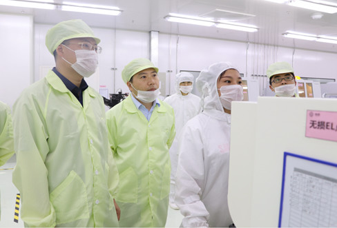 隨后,考察組一行參觀了生產車間,重點觀摩了芯片工藝流程和點測工藝,對現(xiàn)代化的生產技術頻頻稱贊。得知外延生產車間中運作良好的MOCVD設備均為南昌當?shù)仄髽I(yè)生產制造時,盛煒書記對乾照光電對南昌光電產業(yè)發(fā)展的支持表示了贊許。