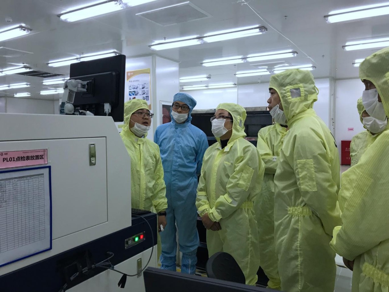 在展廳,李局長認真聽取了公司企業(yè)文化、項目建設規(guī)劃、產(chǎn)品技術優(yōu)勢及應用領域的介紹。隨后,調(diào)研組參觀了外延生產(chǎn)車間,并詳細了解了外延片的生產(chǎn)制作流程和質(zhì)檢工作程序。李局長對江西乾照光電的迅速發(fā)展、現(xiàn)代化生產(chǎn)和智能化工序表示了高度的贊揚。