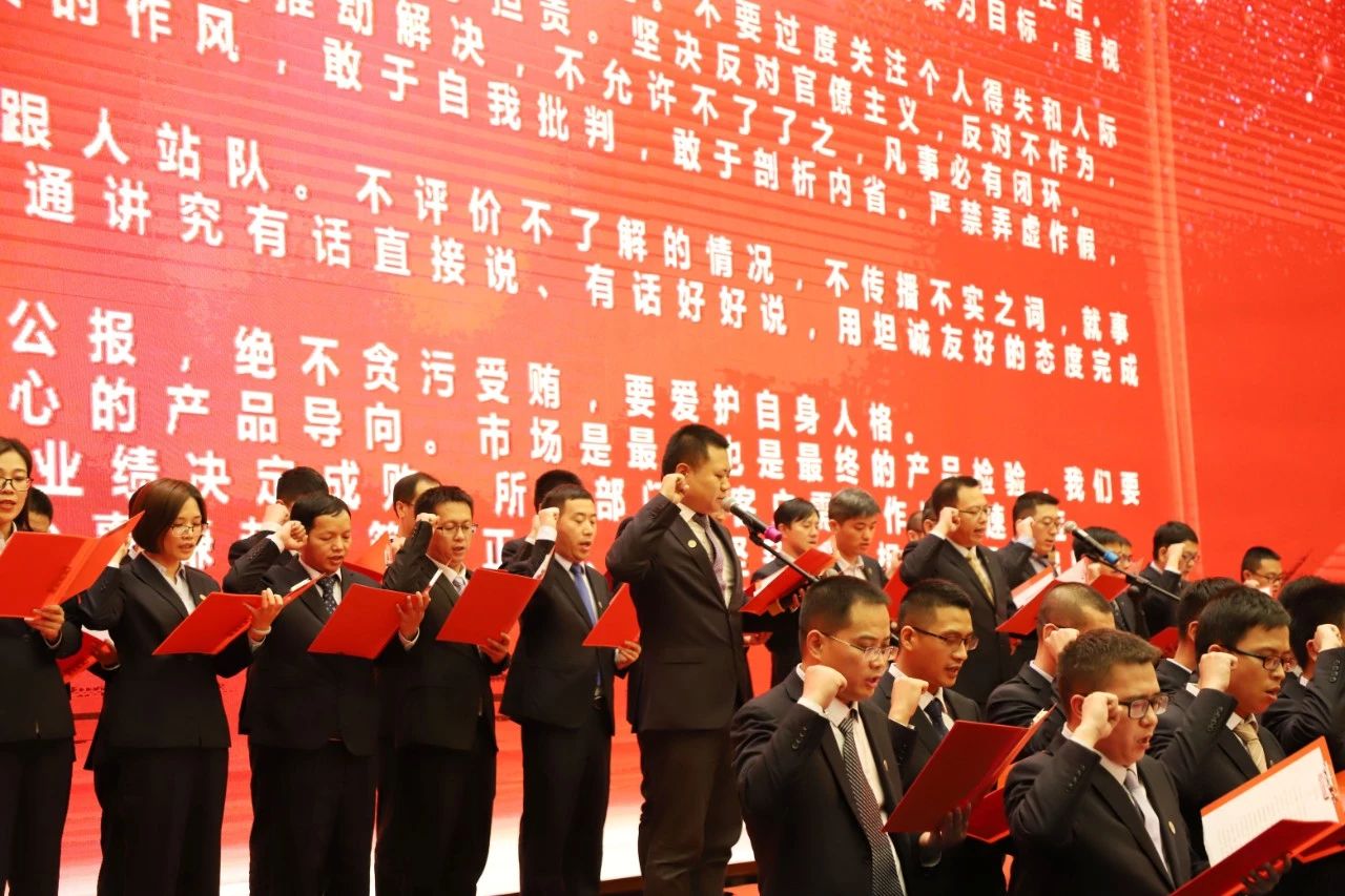 表彰結(jié)束,董事長(zhǎng)金章育,總裁蔡海防帶領(lǐng)著公司經(jīng)理層以上管理人員,面對(duì)全體員工莊嚴(yán)宣誓。隨后,金章育董事長(zhǎng)進(jìn)行致辭發(fā)言,他以“一心”、“砥礪”、“同袍”三個(gè)關(guān)鍵詞完美詮釋了本次尾牙的主題。他希望全體乾照人都能夠理解與踐行“同袍一心,砥礪前行”,鑄鐵軍,展鴻路。最后,股東代表三盛資本總裁王建輝先生作嘉賓致辭,他回憶了自身也曾經(jīng)歷過(guò)的艱難時(shí)期,表示寒冬并不可怕,眾志成城,則為崛起之勢(shì),看好乾照的未來(lái)。