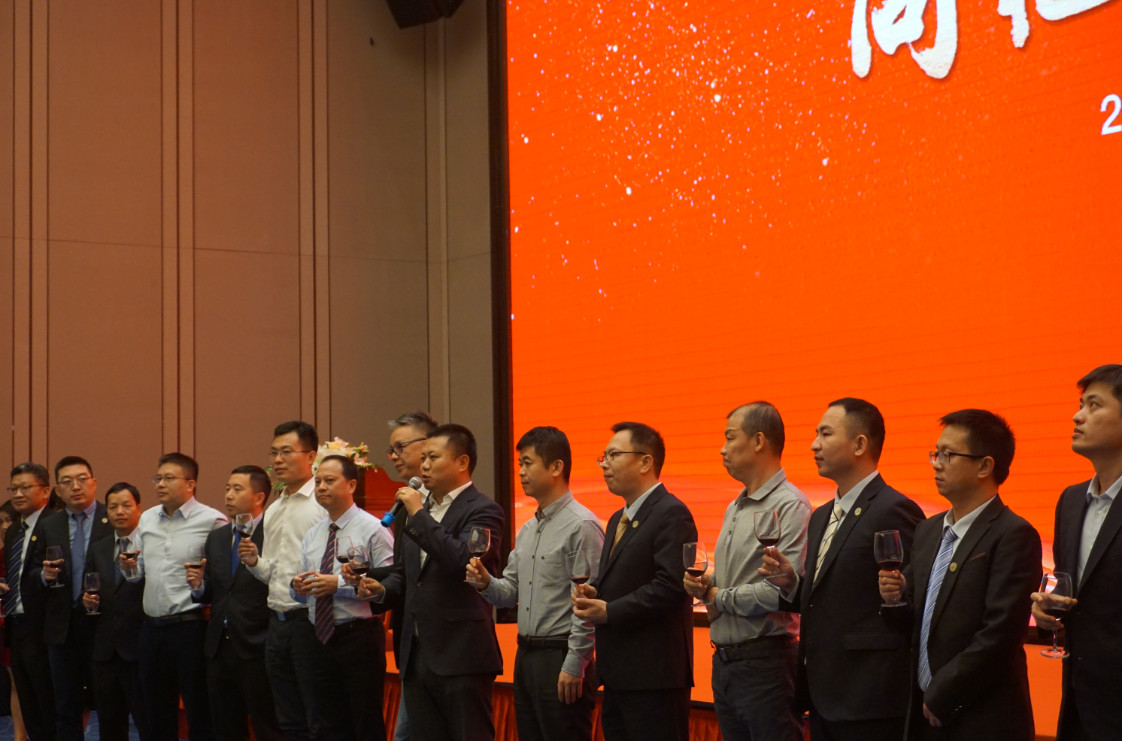 領(lǐng)導(dǎo)致辭后,晚宴正式開(kāi)始。金章育董事長(zhǎng)和嘉賓一起,攜公司高管上臺(tái)致祝酒詞。今夜,我們共同舉杯,敬過(guò)往,也敬未來(lái)!