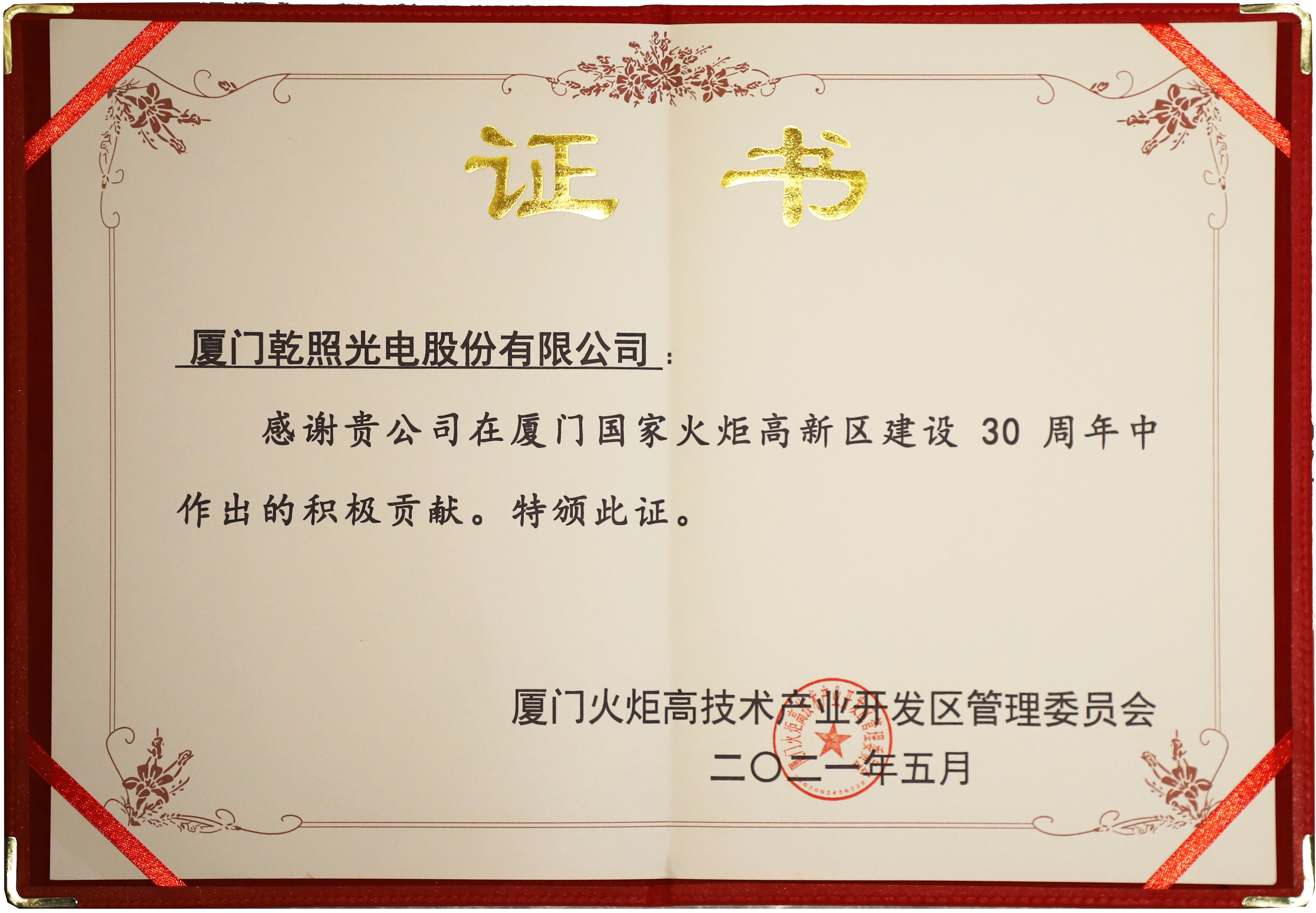 5月9日,廈門國家火炬高新區(qū)建設30周年暨高質量發(fā)展再動員大會在火炬廣場盛大舉行。福建省委常委、廈門市委書記趙龍,科技部原副部長劉燕華、中國國家知識產(chǎn)權局原局長田力普、科學技術部火炬高技術產(chǎn)業(yè)開發(fā)中心主任賈敬敦等國家部委及省市領導出席此次活動。乾照光電榮獲“廈門國家火炬高新區(qū)建設30周年突出貢獻企業(yè)”稱號。