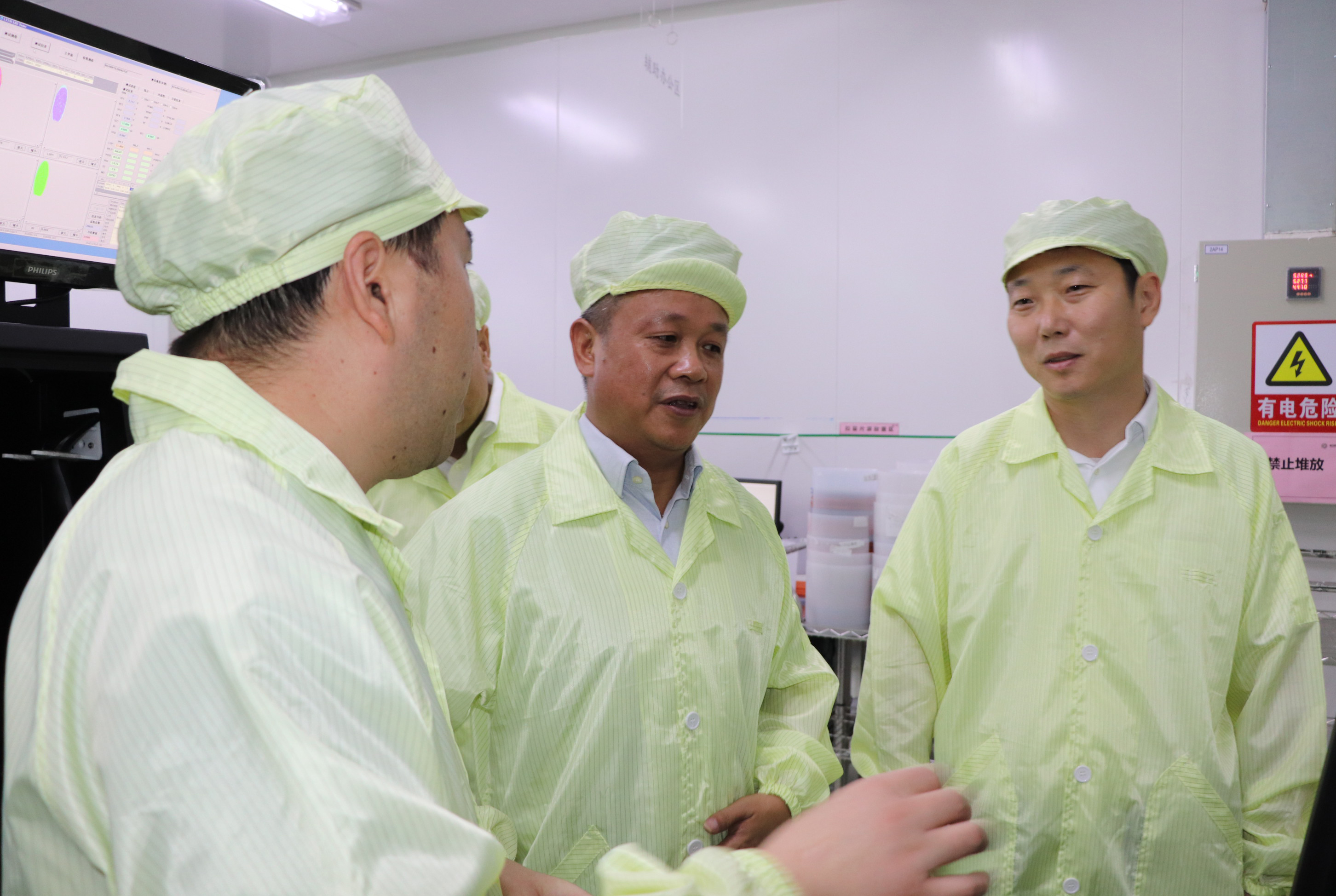 隨后調研組一行前往外延片、芯片生產車間,觀摩了外延片生產技術工藝和芯片點測、分選等流程。調研中,王書記對江西乾照光電迅速發(fā)展的勢態(tài)和智能化的生產工序表示高度的贊賞。他勉勵我們要腳踏實地,立足新建,充分利用現有的資源和平臺,高標準做好科學謀劃,加強技術創(chuàng)新研發(fā),努力提高自主核心競爭力,把企業(yè)做大做強,實現企業(yè)高質量發(fā)展。