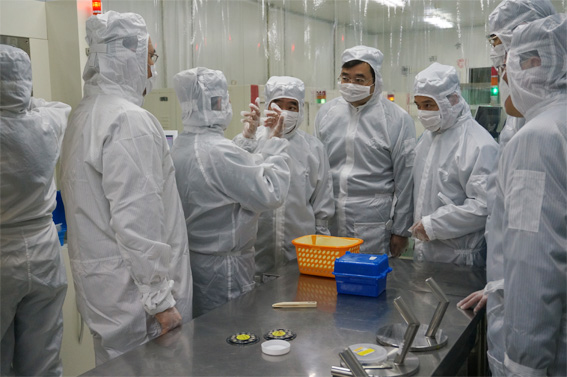 此次調(diào)研,我們陪同市委組織部的領(lǐng)導(dǎo)們參觀了芯片車間的工藝流程,并做了簡(jiǎn)單的工藝介紹。為了能夠近距離的了解到我們的產(chǎn)品,在開(kāi)發(fā)區(qū)管委會(huì)主任季允豐的陪下,同市委組織部部長(zhǎng)張愛(ài)軍等一行6人便穿著無(wú)塵服前去外研車間近距離的觀察、了解我們的產(chǎn)品及性能介紹,并對(duì)我揚(yáng)州乾照光電有限公司引進(jìn)的高層次人才給予了高度的認(rèn)可。