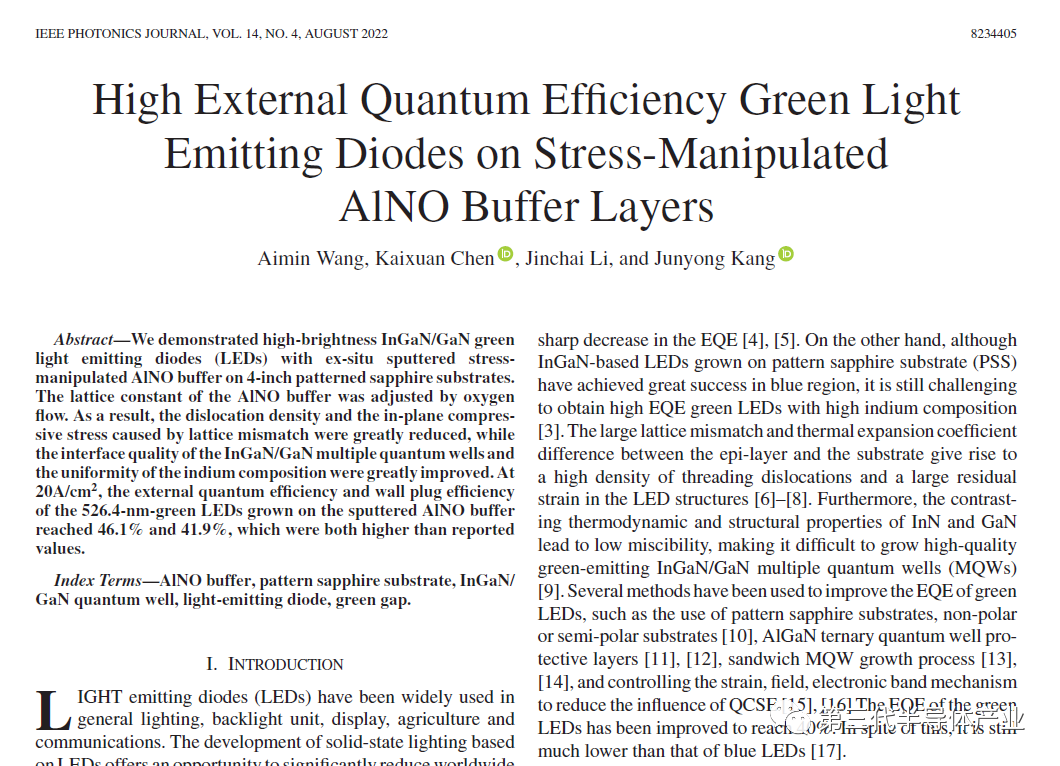 近日,廈門大學物理科學與技術學院與乾照光電協(xié)同攻關,在提升綠光LED效率方面取得重大進展。該研究成果以“High External Quantum Efficiency Green Light Emitting Diodes on Stress-Manipulated AlNO Buffer Layers”為題發(fā)表于IEEE PHOTonICS JOURNAL 14(4) (2022) 8234405。