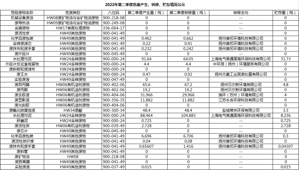揚州乾照光電有限公司2022年第二季度危廢產(chǎn)生、轉(zhuǎn)移、貯存情況公示