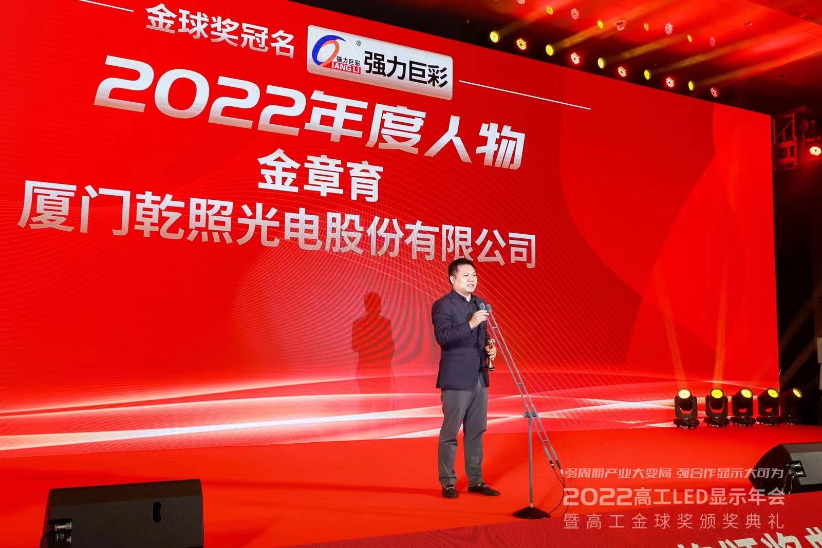 11月24日—25日,由高工LED、高工產(chǎn)研主辦,標(biāo)譜半導(dǎo)體協(xié)辦的主題為“弱周期產(chǎn)業(yè)大變局,強(qiáng)合作顯示大可為”的2022高工LED顯示年會(huì)暨2022高工金球獎(jiǎng)?lì)C獎(jiǎng)典禮在深圳盛大舉行,來(lái)自LED產(chǎn)業(yè)鏈上中下游企業(yè)的數(shù)百位嘉賓歡聚一堂,共襄盛典。乾照光電董事長(zhǎng)金章育榮獲“2022年度人物”、乾照光電榮獲“2022年度創(chuàng)新技術(shù)”獎(jiǎng)項(xiàng)。