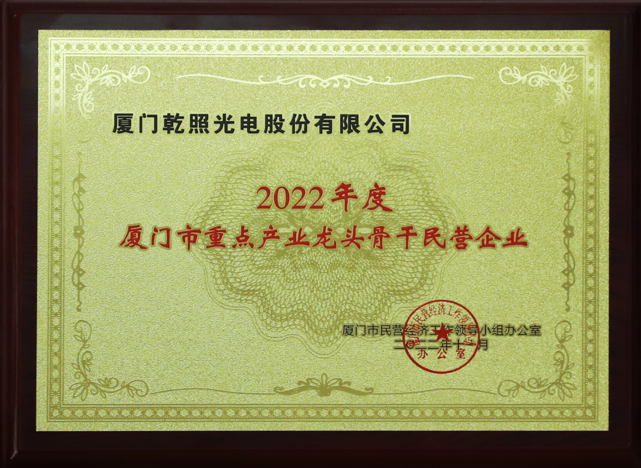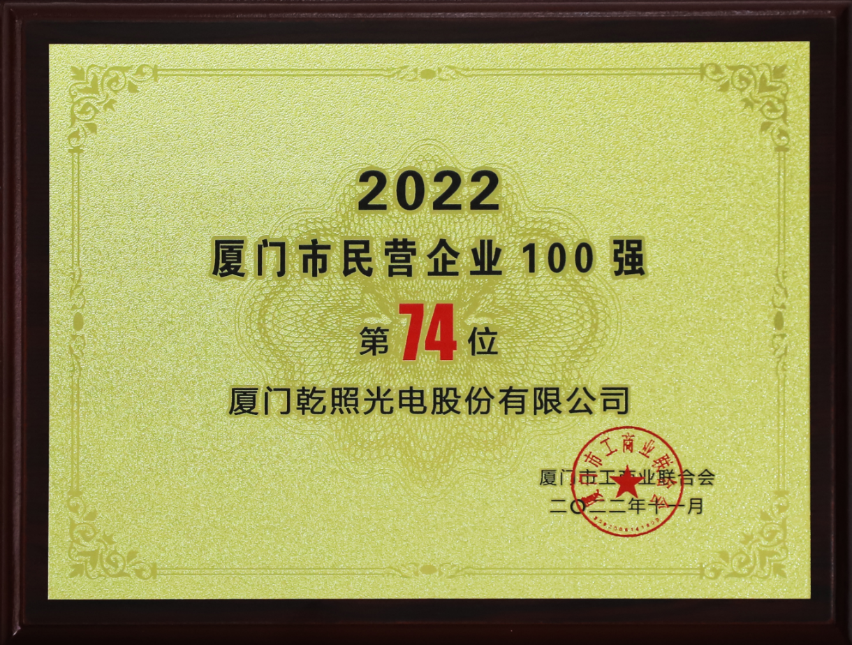 為進(jìn)一步弘揚企業(yè)家精神,推動民營企業(yè)在黨的二十大精神引領(lǐng)下,開啟新征程,奮力新發(fā)展,2月17日上午,2022廈門市民營企業(yè)100強暨龍頭骨干民企授牌儀式在鷺島隆重舉行。廈門乾照光電股份有限公司榮獲 2022廈門市民營企業(yè)100強第74位、2022年度廈門市重點產(chǎn)業(yè)(半導(dǎo)體與集成電路)龍頭骨干民營企業(yè)。