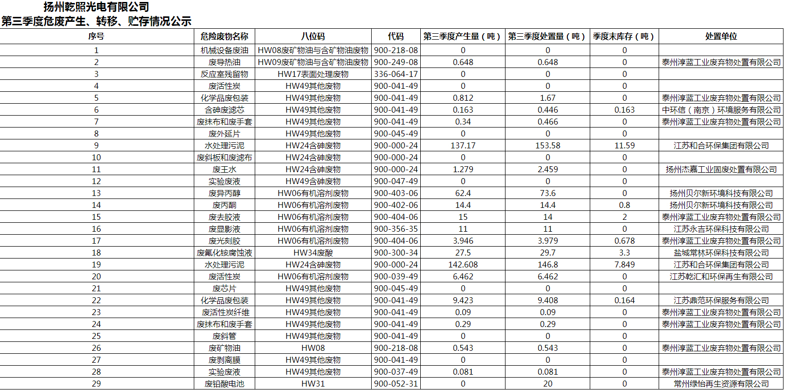 揚州乾照光電有限公司2023年第三季度危廢產(chǎn)生、轉(zhuǎn)移、貯存情況公示