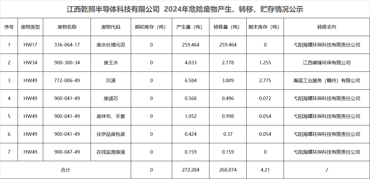 江西乾照半導(dǎo)體科技有限公司 2024年危險廢物產(chǎn)生、轉(zhuǎn)移、貯存情況公示