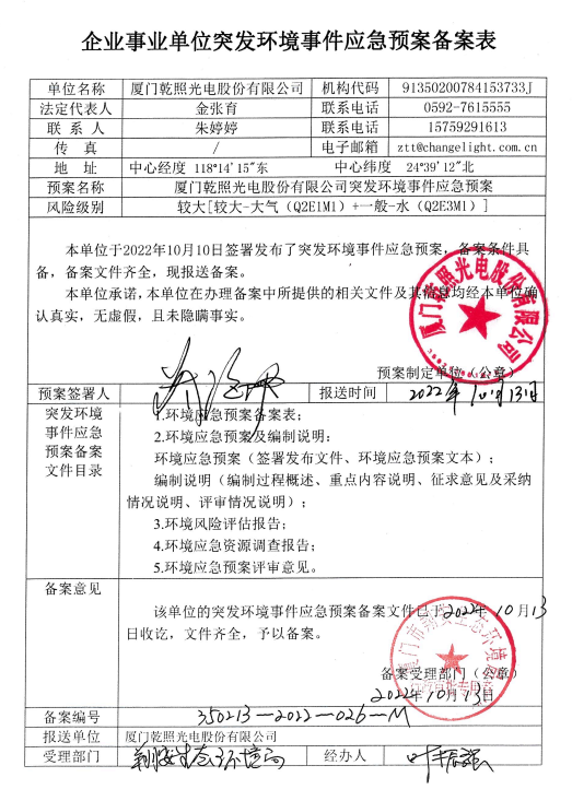 廈門乾照光電股份有限公司突發(fā)環(huán)境事件應(yīng)急預(yù)案公示
