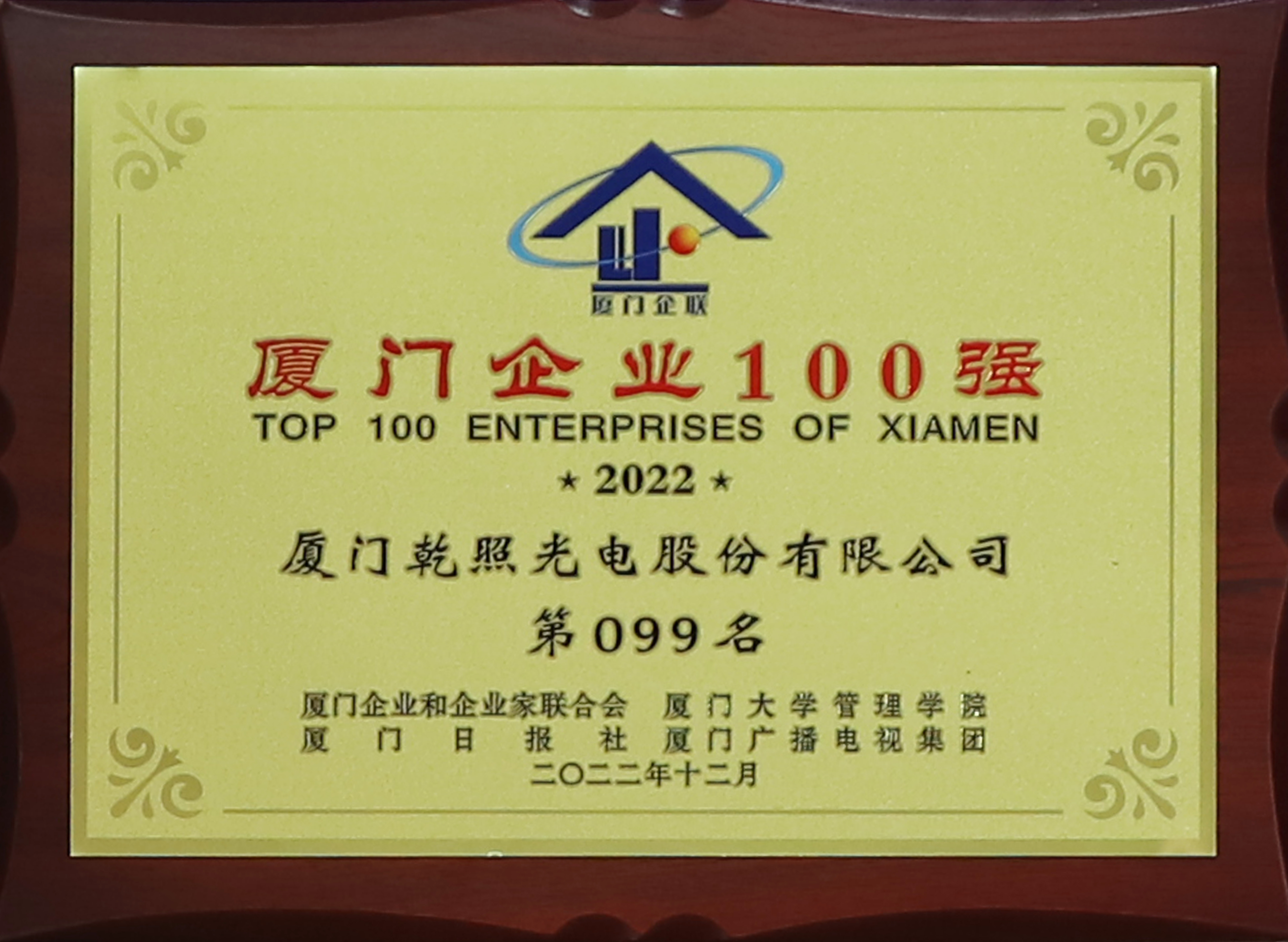 乾照光電榮獲2022廈門企業(yè)100強(qiáng)