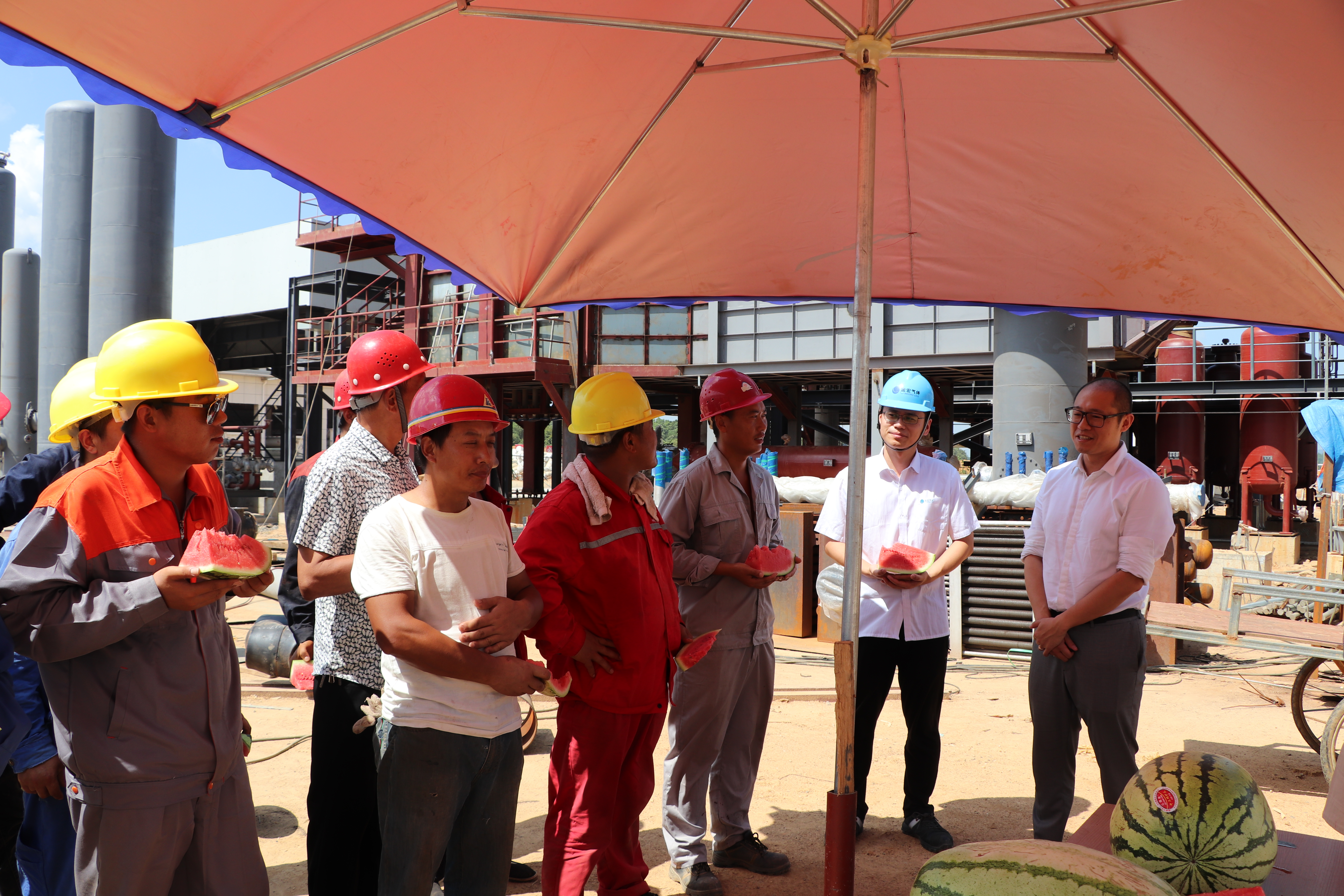 陳文戎先后走訪了制氫站施工現(xiàn)場、機電總包工程朗奧項目部、乾照光電廠務值班室,并親手把西瓜送到工人手中,工人們露出了開心的笑容。