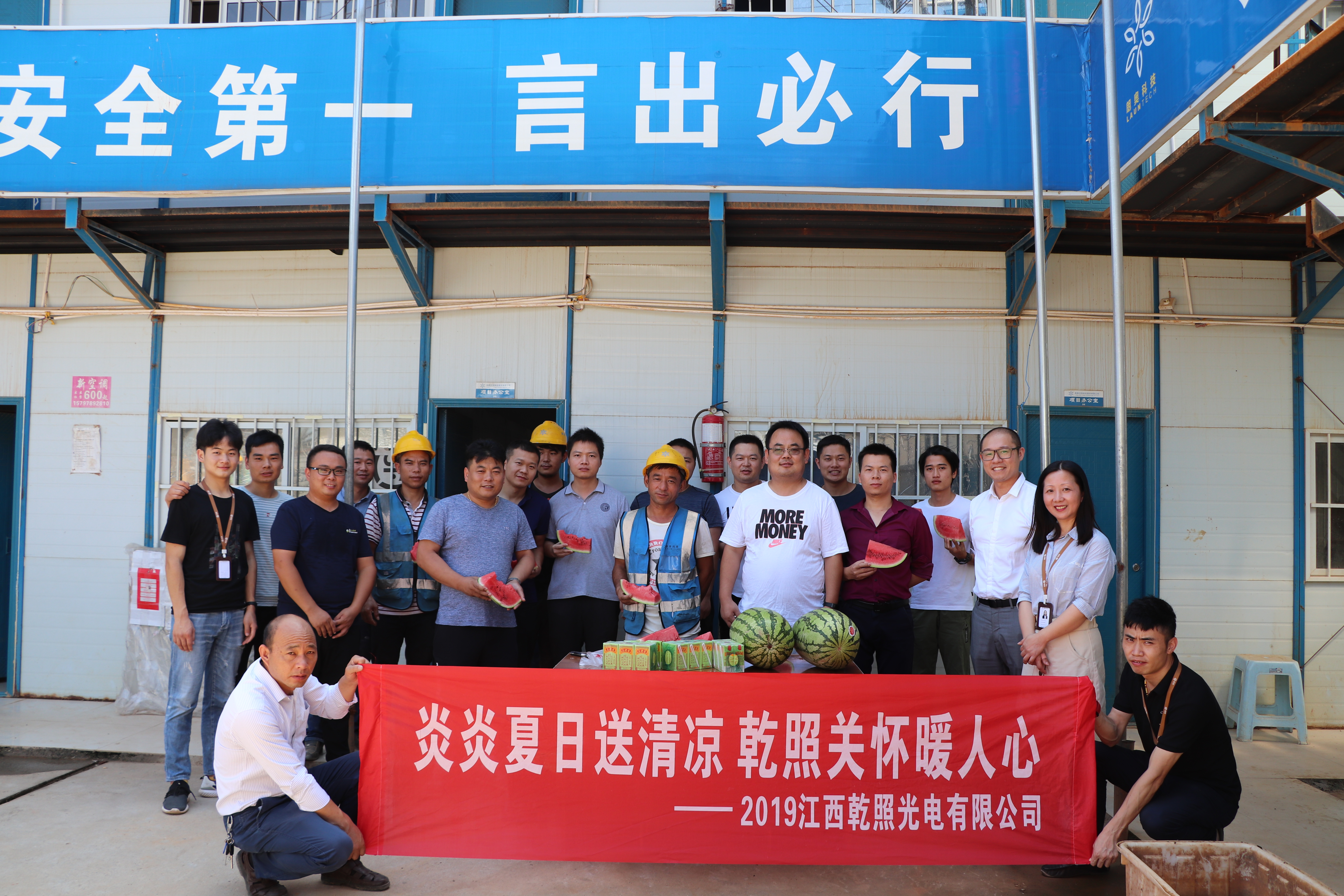 8月9日上午,江西乾照光電有限公司組織開展了“送清涼活動”,副總經(jīng)理陳文戎帶領總經(jīng)辦相關人員來到施工現(xiàn)場,為在一線辛勤工作的工人們送去了西瓜、礦泉水、涼茶和清涼油等消暑物品,并代表公司向大家表示慰問和感謝。