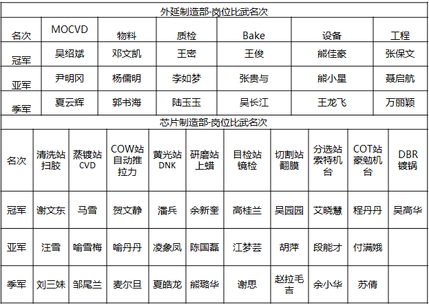 外延崗前比武項目涉及機臺組取放片、質(zhì)檢組鐳刻+測試、物料組發(fā)料PVD操作、Bake組烤爐、工程組硬件、控制率,設(shè)備組球閥、過濾器清理等項目。芯片技能比賽項目包括清洗站掃膠、蒸鍍站CVD、COW站自動推拉力、黃光站DNK、研磨站上蠟、目檢站鏡檢、切割站翻膜、分選站索特機臺、COT站豪勉機臺、DBR鍍鍋等。經(jīng)過多輪比拼,最終46位選手脫穎而出,榮獲各項冠亞季軍。