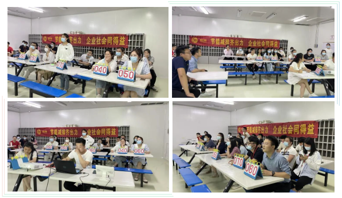 隨后,在公司培訓室又進行了一場關(guān)于能源管理的培訓并同步開展知識答題競賽活動?,F(xiàn)場共吸引30名員工參與,經(jīng)過工作人員系統(tǒng)講解能源和環(huán)保管理等方面的相關(guān)知識后,緊張而又激烈的知識競賽就開始了!競賽中,五人一組,隨機搶答,選手們?nèi)褙炞?、認真思索,以昂揚的斗志、飽滿的熱情投入到比賽中。現(xiàn)場氣氛活躍,最后經(jīng)過激烈PK,六名選手獲得了本次比賽大獎!
