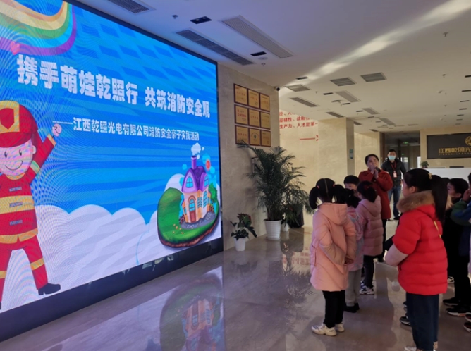 本次活動共吸引了近30個家庭參與,孩子們來到父母工作的地方——江西乾照光電有限公司進行參觀,在公司展廳了解了公司的基本情況及產(chǎn)品展示,在“幸福家庭大講堂”認真觀看了消防安全宣傳教育視頻并參與了互動問答。